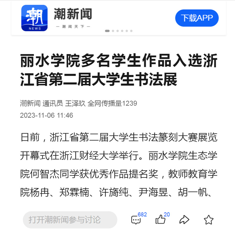 11月6日,潮新闻客户端刊发了我校多名学生作品入选浙江省第二届大学生书法展的消息。