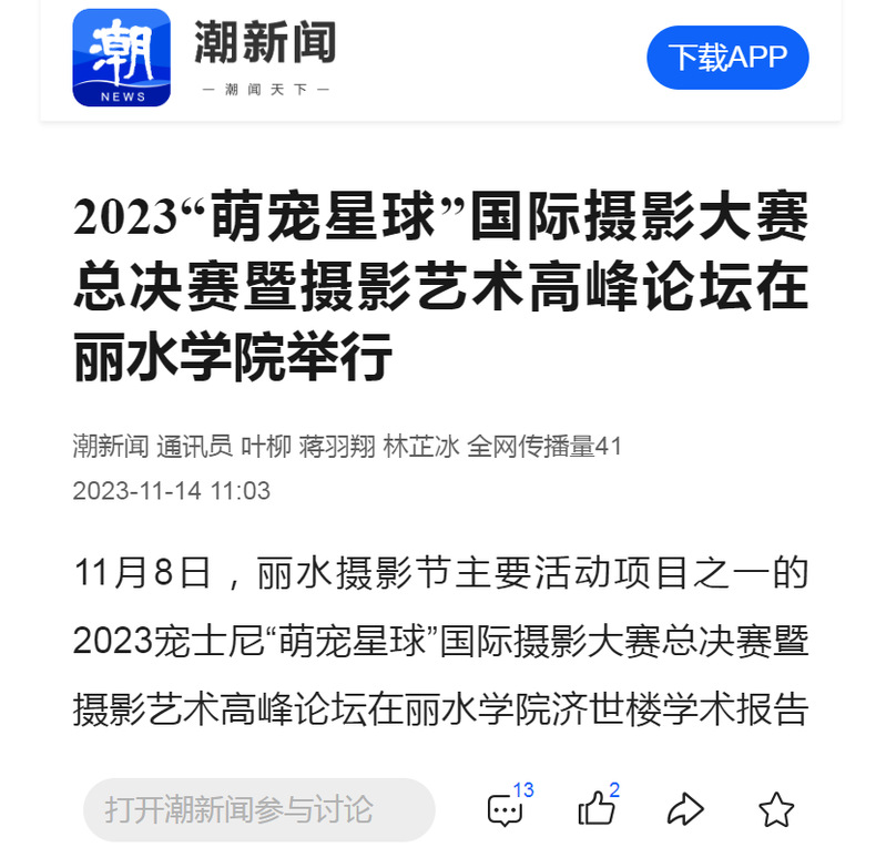 11月14日,潮新闻客户端刊发了2023“萌宠星球”国际摄影大赛总决赛暨摄影艺术高峰论坛在我校举行的消息。