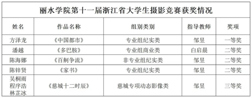 近日,“慈城杯”第十一届浙江省大学生摄影竞赛落下帷幕,我校学生作品荣获一等奖1项,二等奖3项,三等奖1项,摄影专业邹昱老师获得“优秀指导教师奖”,丽水学院获得“优秀组织奖”。