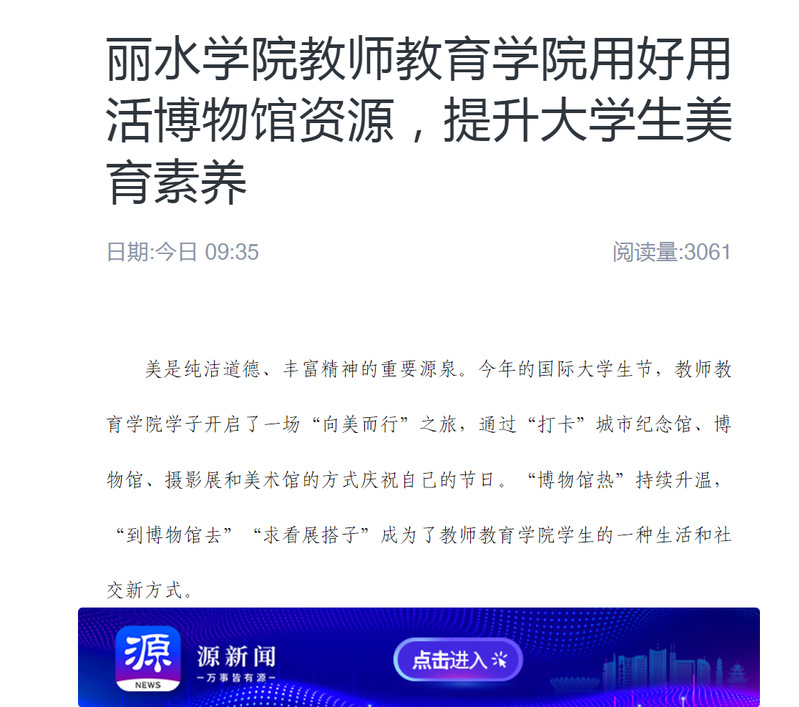 11月14日,源新闻客户端刊发了我校教师教育学院用好用活博物馆资源,提升大学生美育素养的消息。