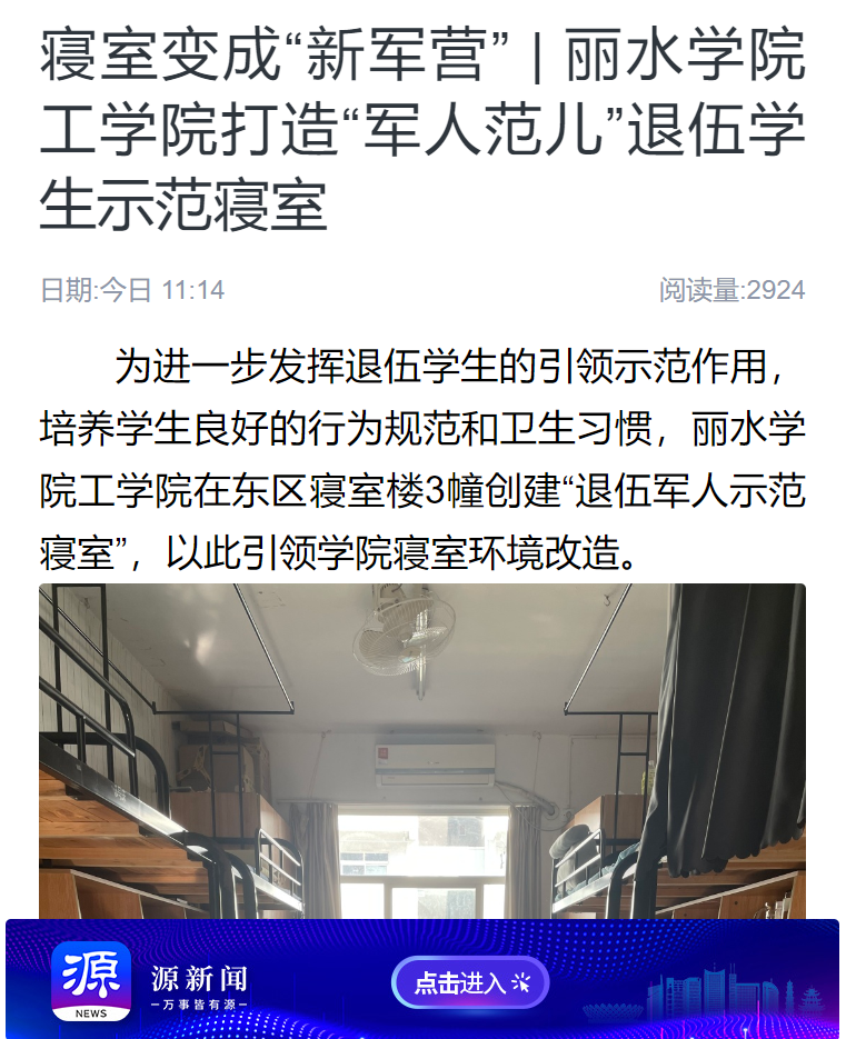 11月20日,源新闻客户端刊发了我校工学院打造“军人范儿”退伍学生示范寝室的消息。