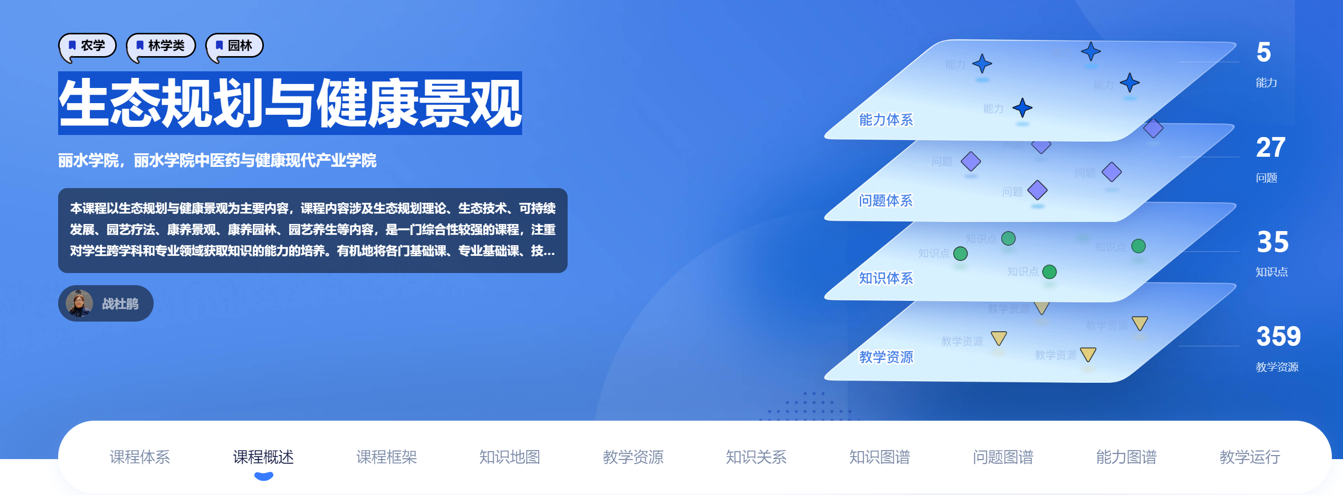 中医药与健康产业学院在课程建设中,充分考虑教育数字化的发展,积极探索新的教学模式,《生态规划与健康景观》课程团队与智慧树团队深度合作,探索性地进行了新形态图谱课程的建设。目前课程团队已经完成30余个知识点的梳理,300多个教学资源的整合,并完成了课程部分高价值经典问题与能力的提取,预计年底完成新形态课程知识图谱的建设。