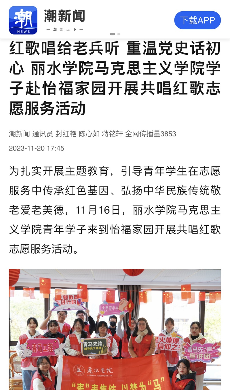 11月20日,潮新闻客户端刊发了关于我校马克思主义学院青年学子开展共唱红歌志愿服务活动的消息。