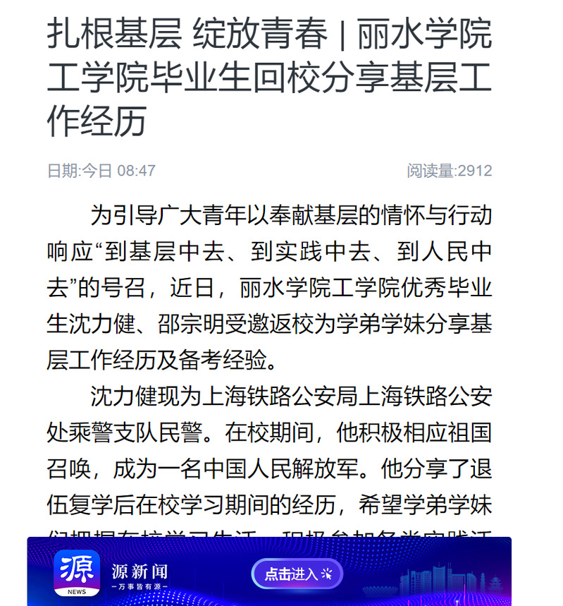 11月24日,源新闻客户端刊发了我校工学院毕业生回校分享基层工作经历。