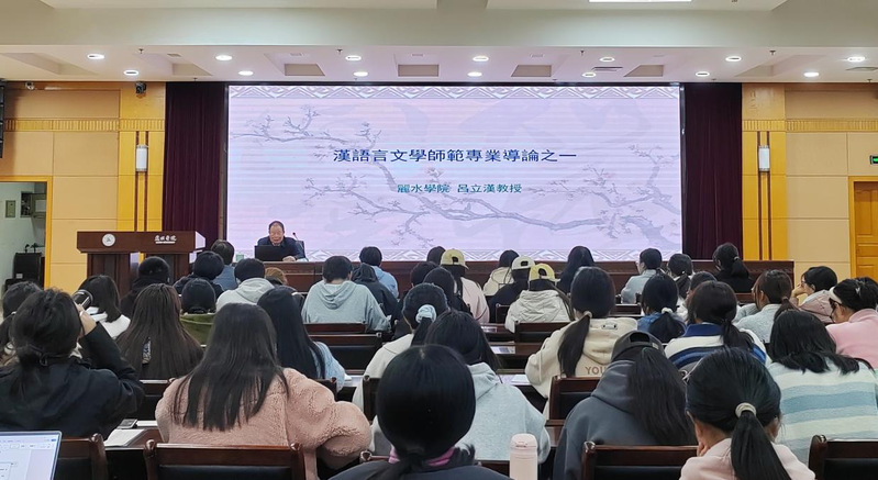 吕立汉结合自身对汉语言文学师范专业的理解以及从教经历,从专业认知定位切入,围绕“学高为师,身正为范”这一主题展开讲述。他强调,作为传道、授业、解惑者,道德品德和人格修炼是教师的根基,为人师者要树立正确的为人之道,以育人为本,以师德为重,帮助学生树立正确的世界观、人生观、价值观。吕立汉从“为何读书”“读什么书”“怎么读书”三个方面进行深入讲析,引导学生认识学科知识素养的重要性,希望同学们珍惜学习时光,朝着知识渊博、功底深厚、能说会写的目标努力奋发图强。