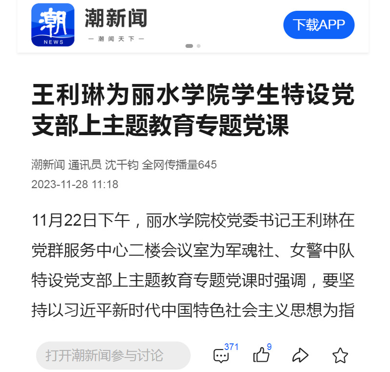 11月28日,潮新闻客户端刊发了我校党委书记王利琳为学生特设党支部上主题教育专题党课的消息。