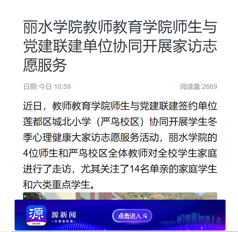 12月1日,源新闻客户端刊发了我校教师教育学院师生与党建联建单位协同开展家访志愿服务的消息。