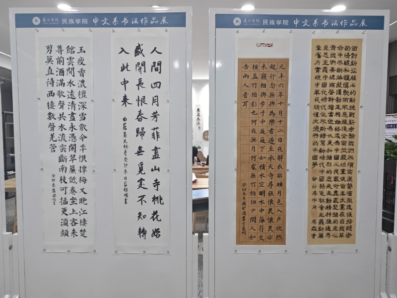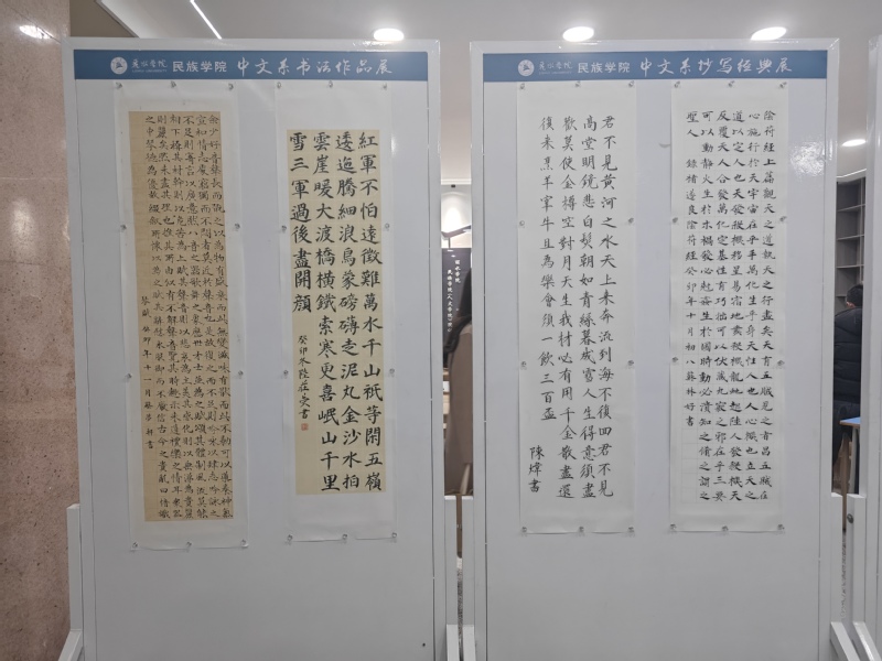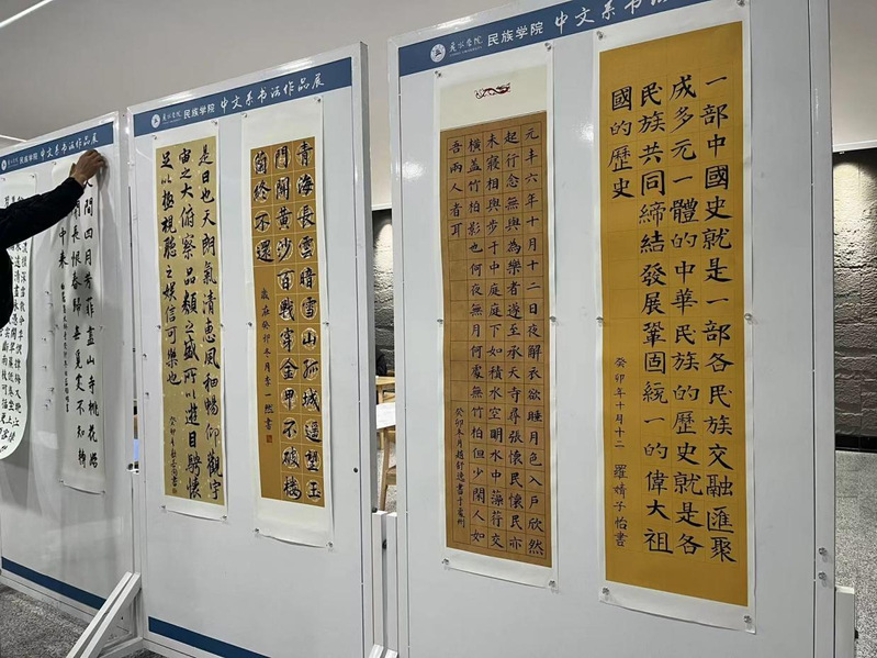 展出作品以人文经典、民族团结、铸牢中华民族共同体等为主题,汇聚多种字形字体,顿挫有致、苍劲有力。一张张书法作品自然灵动,在横竖撇捺、笔起笔落中展示着丹青韵味,在笔墨的舒展与晕染中,尽显中文系学子的专业素养与艺术风采。同时,同学们以书法艺术为媒,书写出了自信自强、踔厉奋发的意气,表达、传递了浓浓的民族情谊。