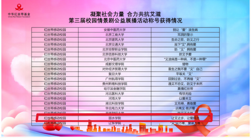 2023年12月1日是第36个世界艾滋病日。在第36个世界艾滋病日来临之际,世界艾滋病日主题宣传活动暨第三届校园情景剧推优作品揭晓仪式在京举办。共有来自全国67所高校参与活动,此次活动要求情景剧的制作以防艾抗艾为主线,融入艾滋病防治知识,展示出深刻的教育意义和科学防艾的导向性。我校“携爱同行,为‘艾’发声”团队在创作的过程中,立足社会实践、突出主题特色,综合利用跨学科的理论知识,向评委和大众展示出了团队独特的专业思维以及良好的艺术素养。经过作品征集、审核整理、大众投票、专家评审,共推选出50部作品进入评优环节,最终我校获“红丝带感动校园”荣誉称号。