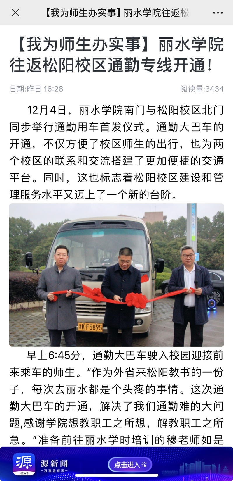 12月4日,源新闻客户端刊发了我校往返松阳校区通勤专线开通的消息。