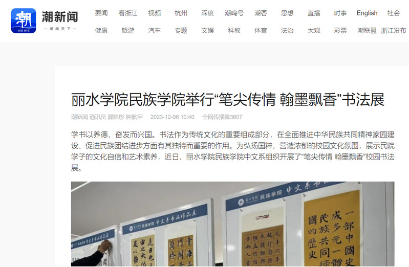 12月6日,潮新闻客户端刊发了我校民族学院举行“笔尖传情 翰墨飘香”书法展的相关消息。