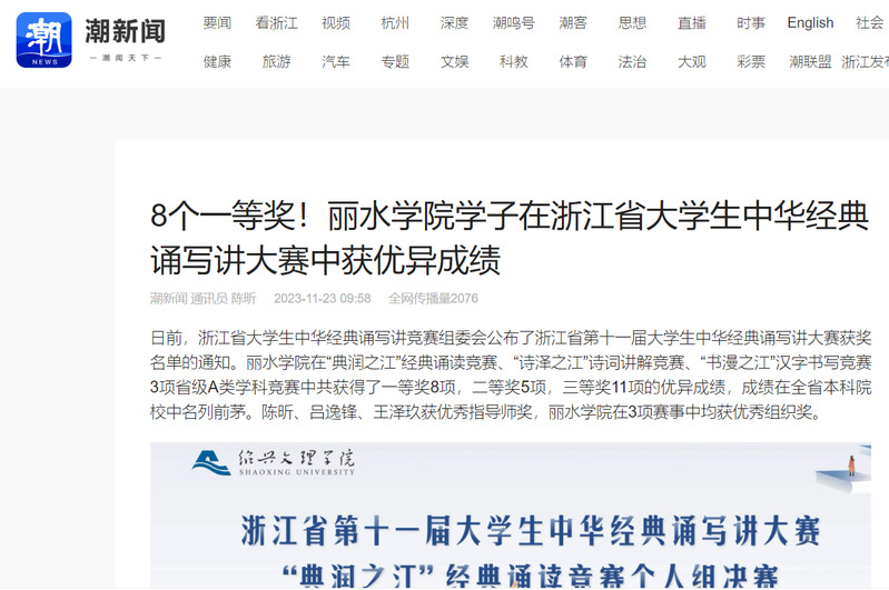 11月23日,潮新闻客户端刊发了我校学子在浙江省大学生中华经典诵写讲大赛中获优异成绩的相关消息。
