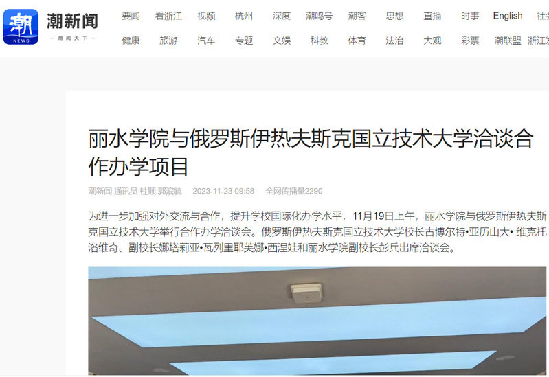 11月23日,潮新闻客户端刊发了我校与俄罗斯伊热夫斯克国立技术大学洽谈合作办学项目的相关消息。