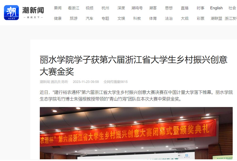 11月23日,潮新闻客户端刊发了我校学子获第六届浙江省大学生乡村振兴创意大赛金奖的相关消息。