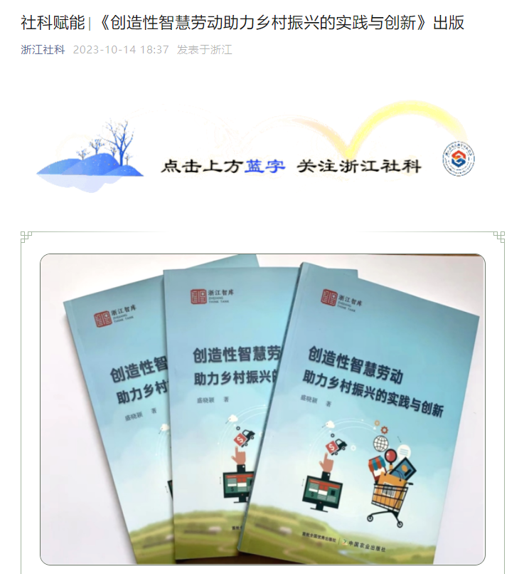10月14日,浙江社科公众号发布了我校教师盛晓颖所著的《创造性智慧劳动助力乡村振兴的实践与创新》出版的消息。