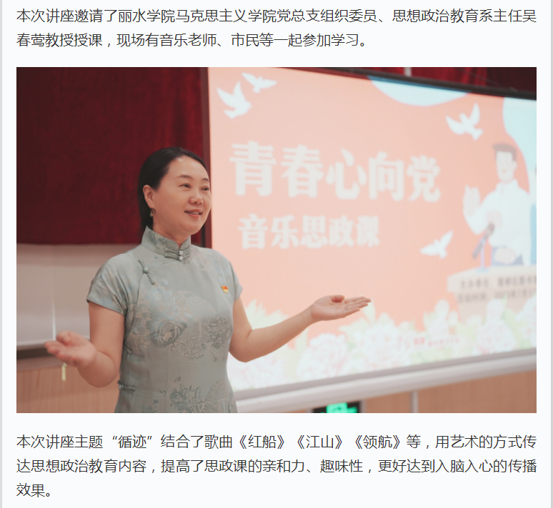 7月21日,学习强国浙江学习平台刊发了我校吴春莺老师主讲“音乐思政课”的消息。
