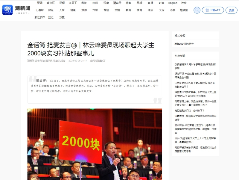 2月25日,潮新闻客户端刊发了市政协委员、农工党丽水学院支部主委、工学院林云峰教授在丽水市政协五届三次会议第一次全体会议(开幕会)上的即席发言。