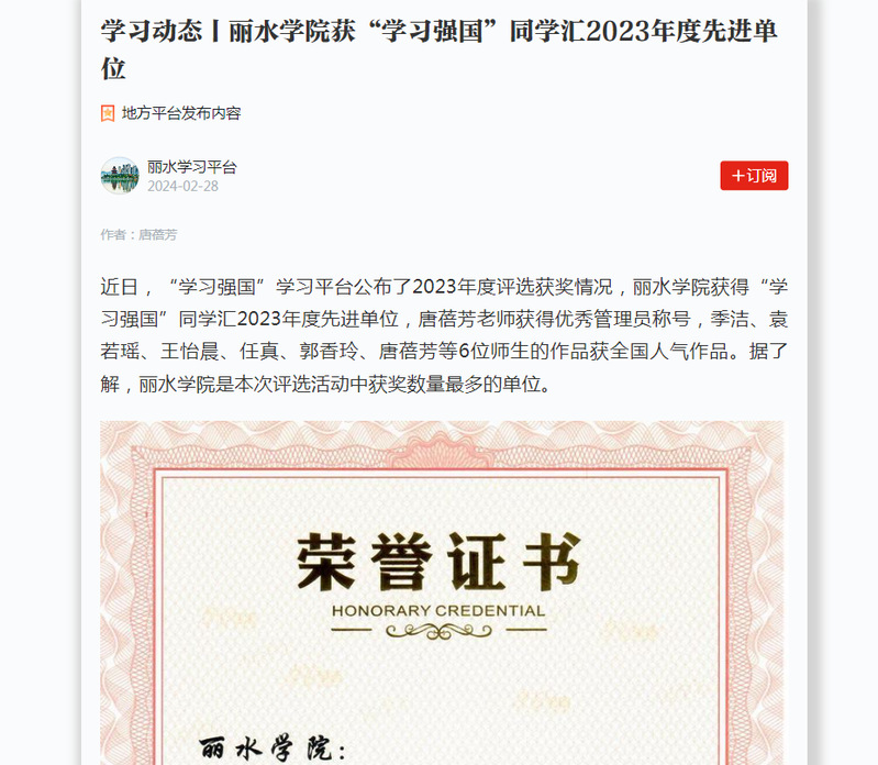 2月28日,学习强国丽水学习平台刊发了我校获得“学习强国”同学汇2023年度先进单位的消息。
