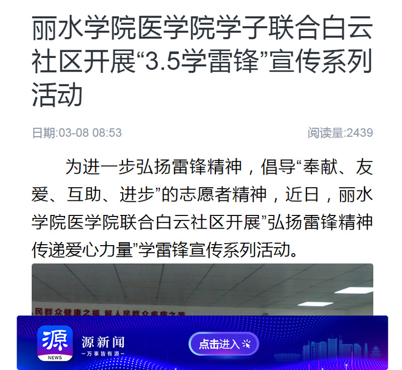 3月8日,源新闻客户端刊发了我校医学院学子联合白云社区开展“3.5学雷锋”宣传系列活动的消息。
