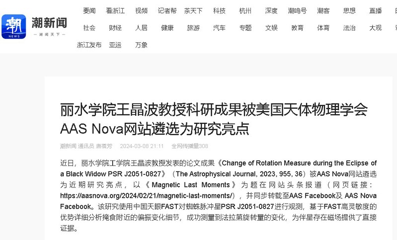 3月8日,潮新闻客户端刊发了我校王晶波教授科研成果被美国天体物理学会AAS Nova网站遴选为研究亮点的消息。