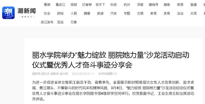 3月8日,潮新闻客户端刊发了我校举办“魅力绽放 丽院她力量”沙龙活动启动仪式暨优秀人才奋斗事迹分享会的消息。