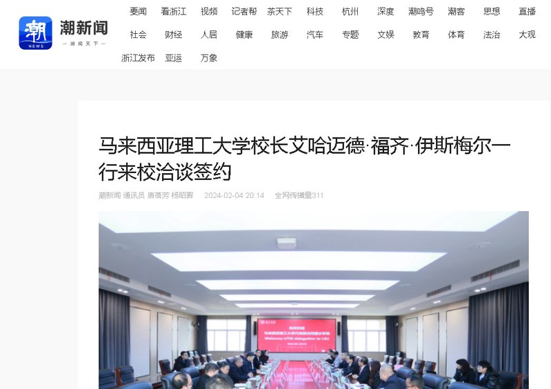 3月8日,潮新闻客户端刊发了马来西亚理工大学校长艾哈迈德·福齐·伊斯梅尔一行来我校洽谈签约的消息。