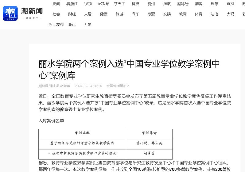 2月4日,潮新闻客户端刊发了我校两个案例入选“中国专业学位教学案例中心”案例库的消息。
