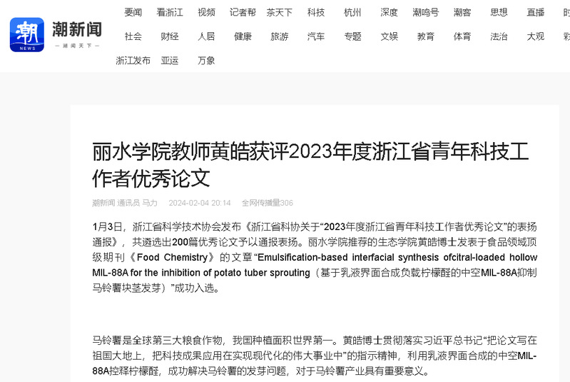 2月4日,潮新闻客户端刊发了我校教师黄皓获评2023年度浙江省青年科技工作者优秀论文的消息。