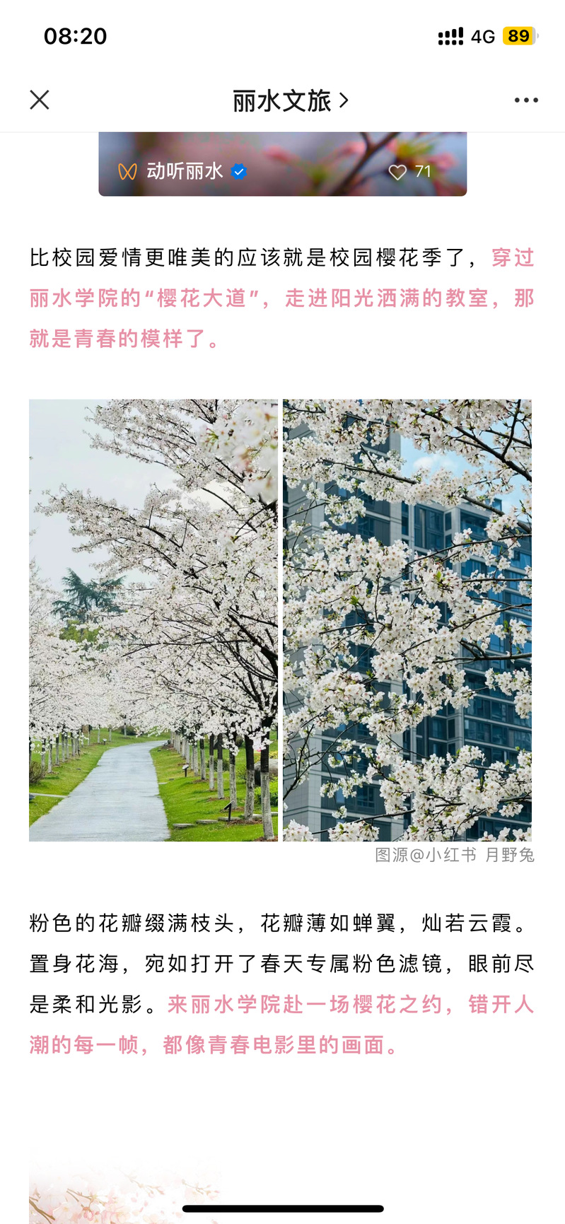 3月24日,丽水文旅发布了关于我校樱才园樱花大道的相关内容。