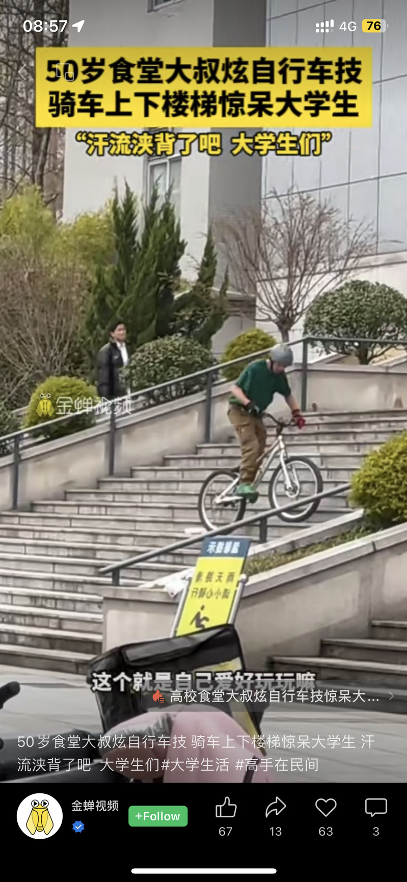 金蝉视频:50岁食堂大叔炫自行车技 骑车上下楼梯惊呆大学生