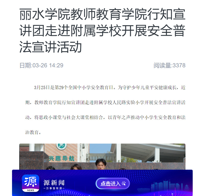 3月26日,源新闻客户端刊发了我校教师教育学院行知宣讲团走进附属学校开展安全普法宣讲活动的消息。