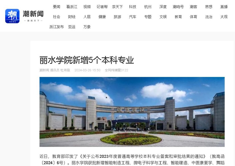 3月26日,潮新闻报道了关于我校新增5个本科专业的消息。