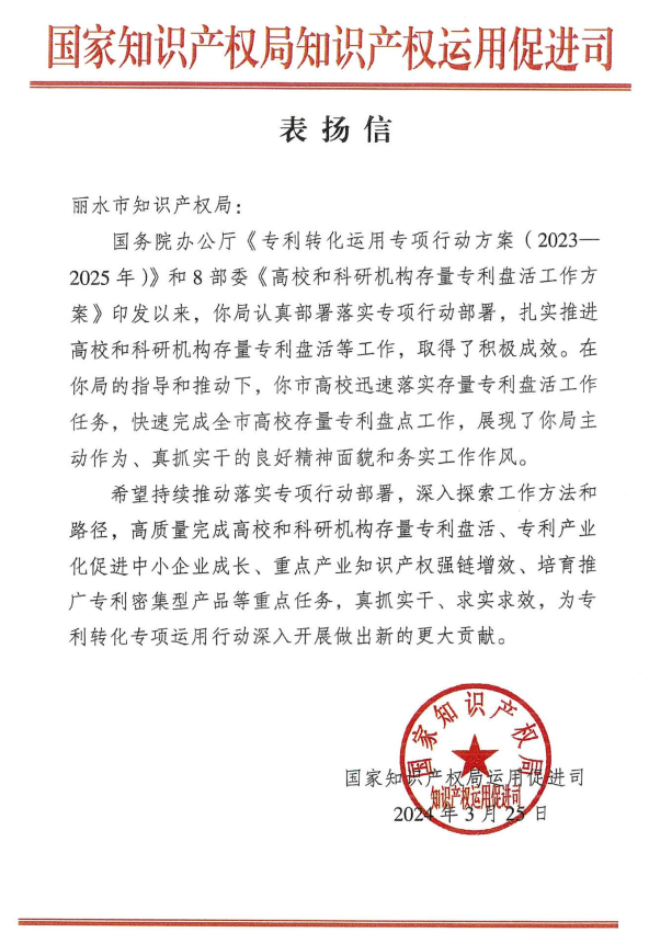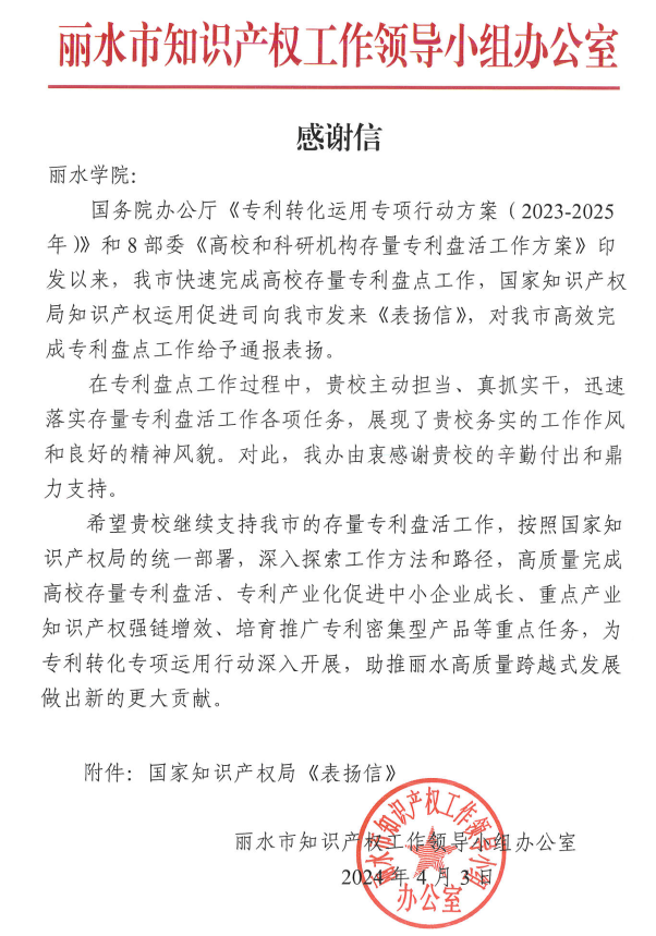 近日,我市高校存量专利盘点工作收到国家知识产权局运用促进司的表扬信,同时丽水市知识产权工作领导小组办公室给我校发来感谢信,对快速完成盘点任务予以高度肯定。