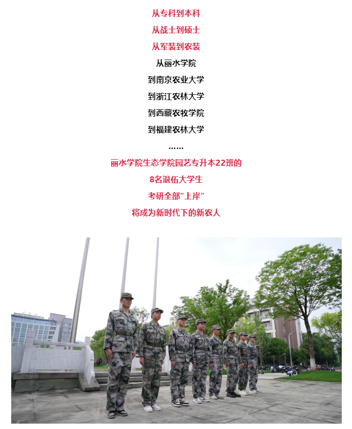4月29日,丽水网刊发了我校生态学院园艺专升本22班8名退伍大学生同时考研上岸的消息。