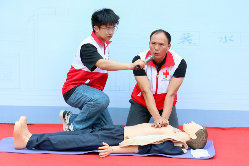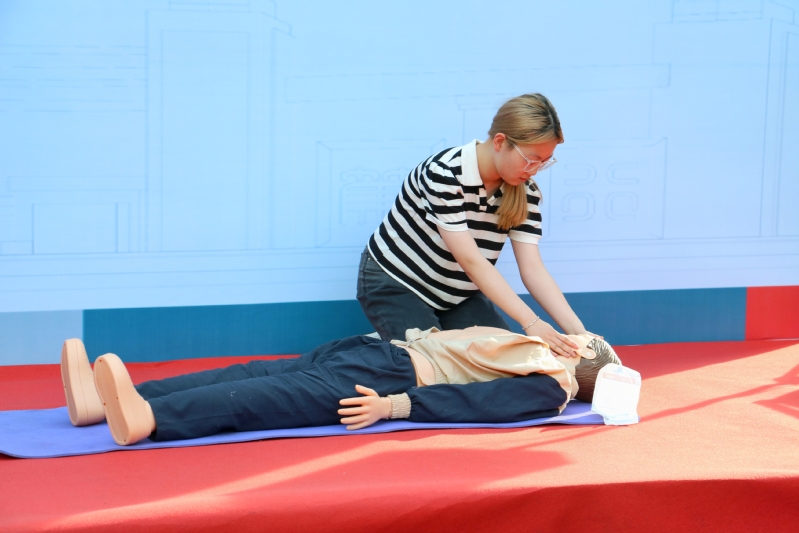 之后,演练进入第二阶段——防灾减灾知识学习和应急技能学习及演练。现场保卫处消防科为同学们演示了手提式干粉灭火器的正确使用方法;急救先锋联盟志愿者为师生展示了心肺复苏的紧急救援措施并对伤者身体的摆放方式、按压的位点、力度等急救知识进行详细讲解。学习完专业知识后,同学们上台进行现场实操。