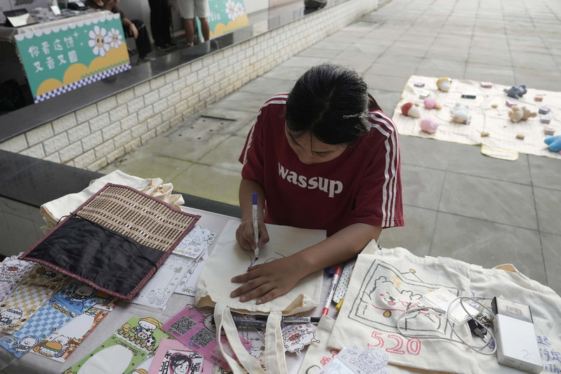 集市现场,热闹非凡,摊位云集,商品琳琅满目,摊主们创艺无限,以手工艺品为亮点,艺术与商品相融,将精美的手绘明信片、青翠的陶瓷制品、独特的艺术漆扇等等呈现在顾客面前,无不突显青年学子的创意与匠心。