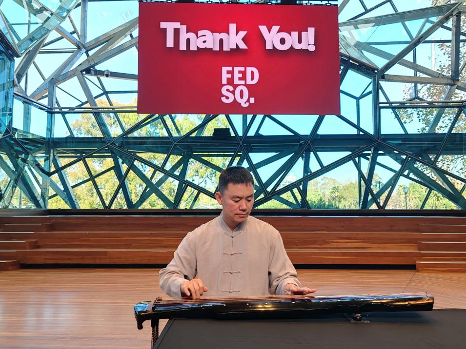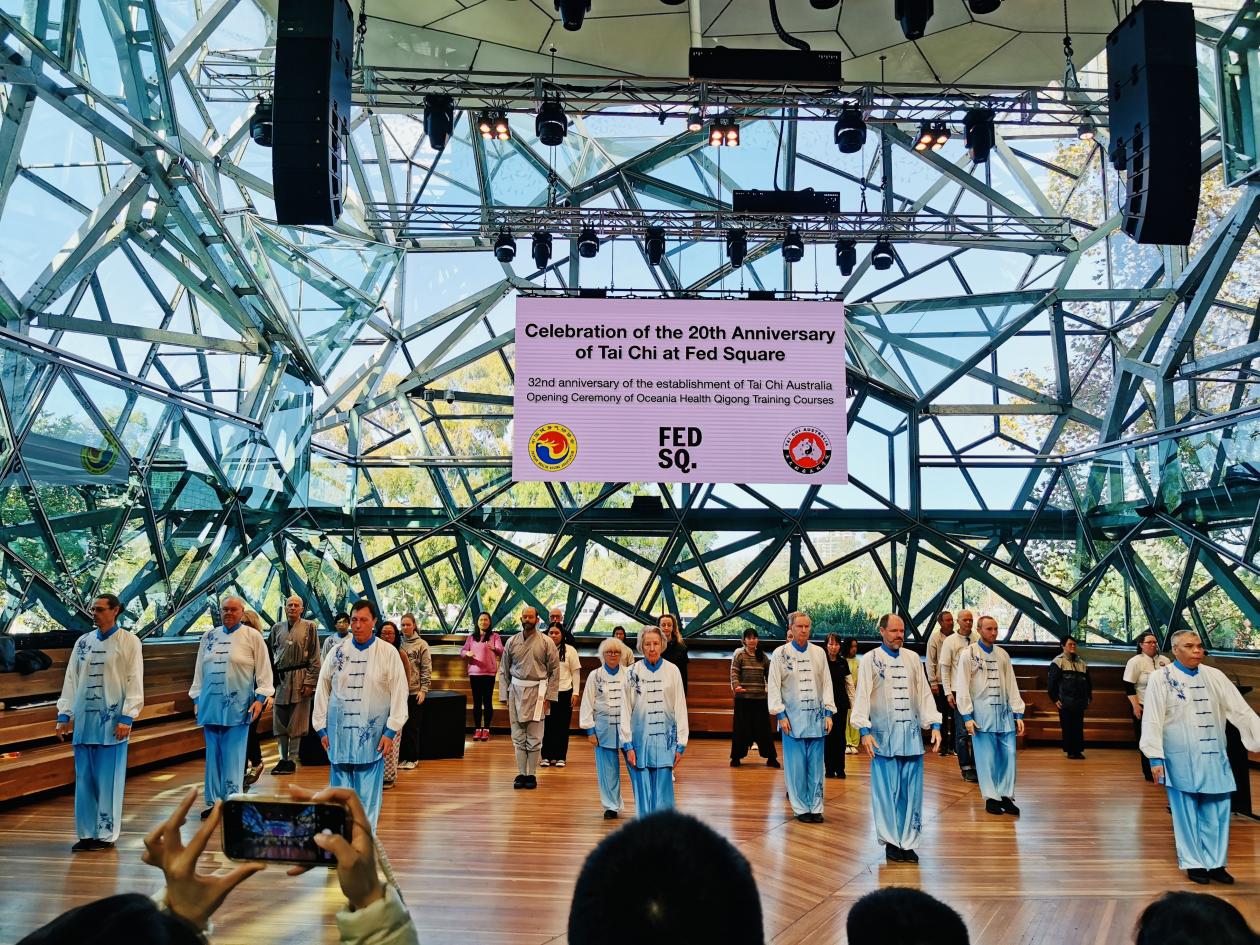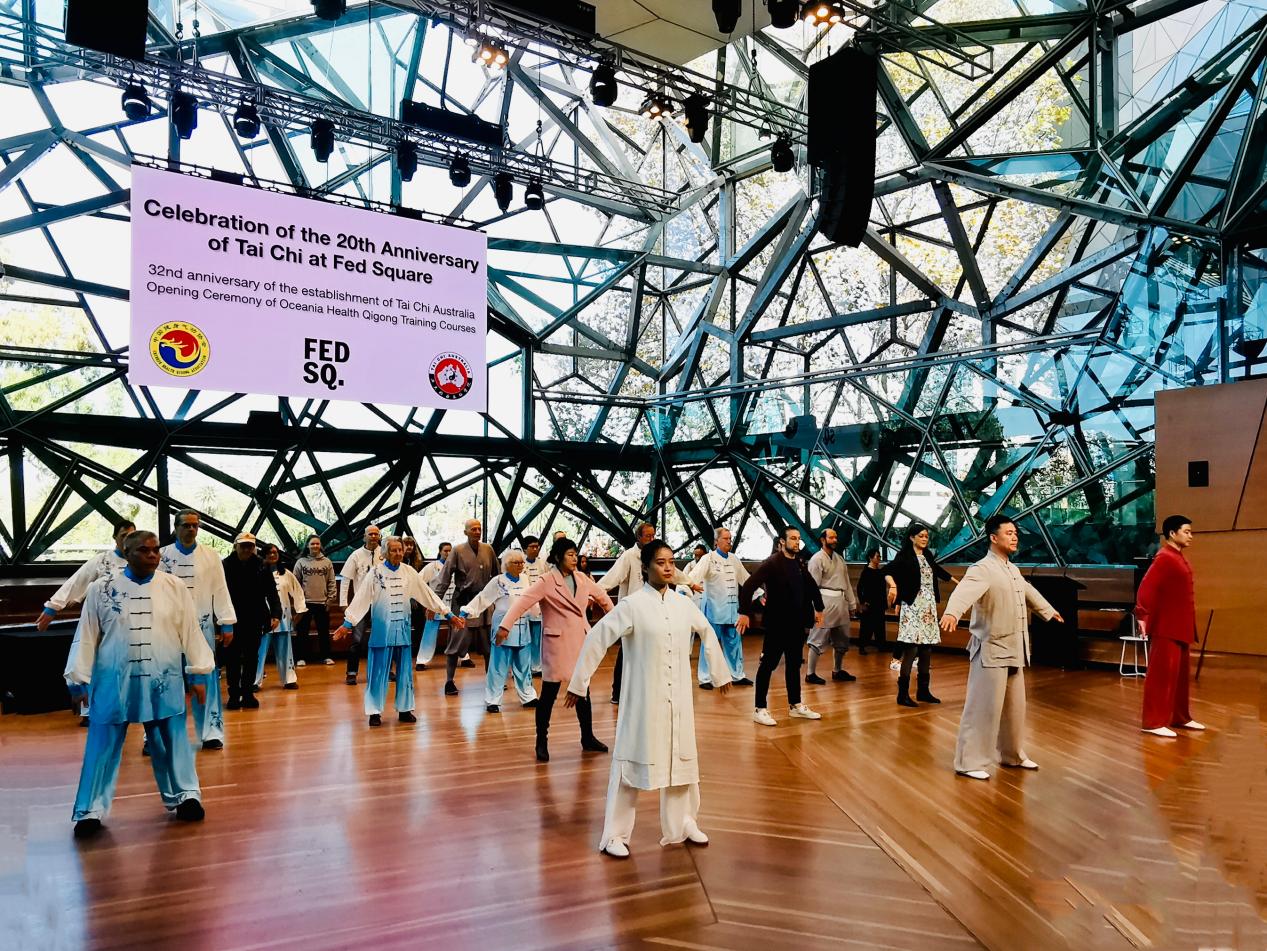 此外,晁胜杰随代表团在澳大利亚联邦广场参与组织了大洋洲健身气功培训班开班仪式暨太极拳在联邦广场推广20 周年及澳大利亚太极学院成立32 周年庆典活动。联邦广场首席执行官Katrina Sedgwick、国家体育总局健身气功管理中心主任董军、中国驻墨尔本总领事馆副总领事刘东源、墨尔本市政府议员Councillor Jamal Hakim、澳大利亚太极学院院长韩劲松出席并致辞讲话。活动现场百余人参加,代表团与学员们分别展演了古琴、太极剑、太极拳、少林棍、大舞、太极扇、导引养生功十二法、五禽戏、易筋经、八段锦。