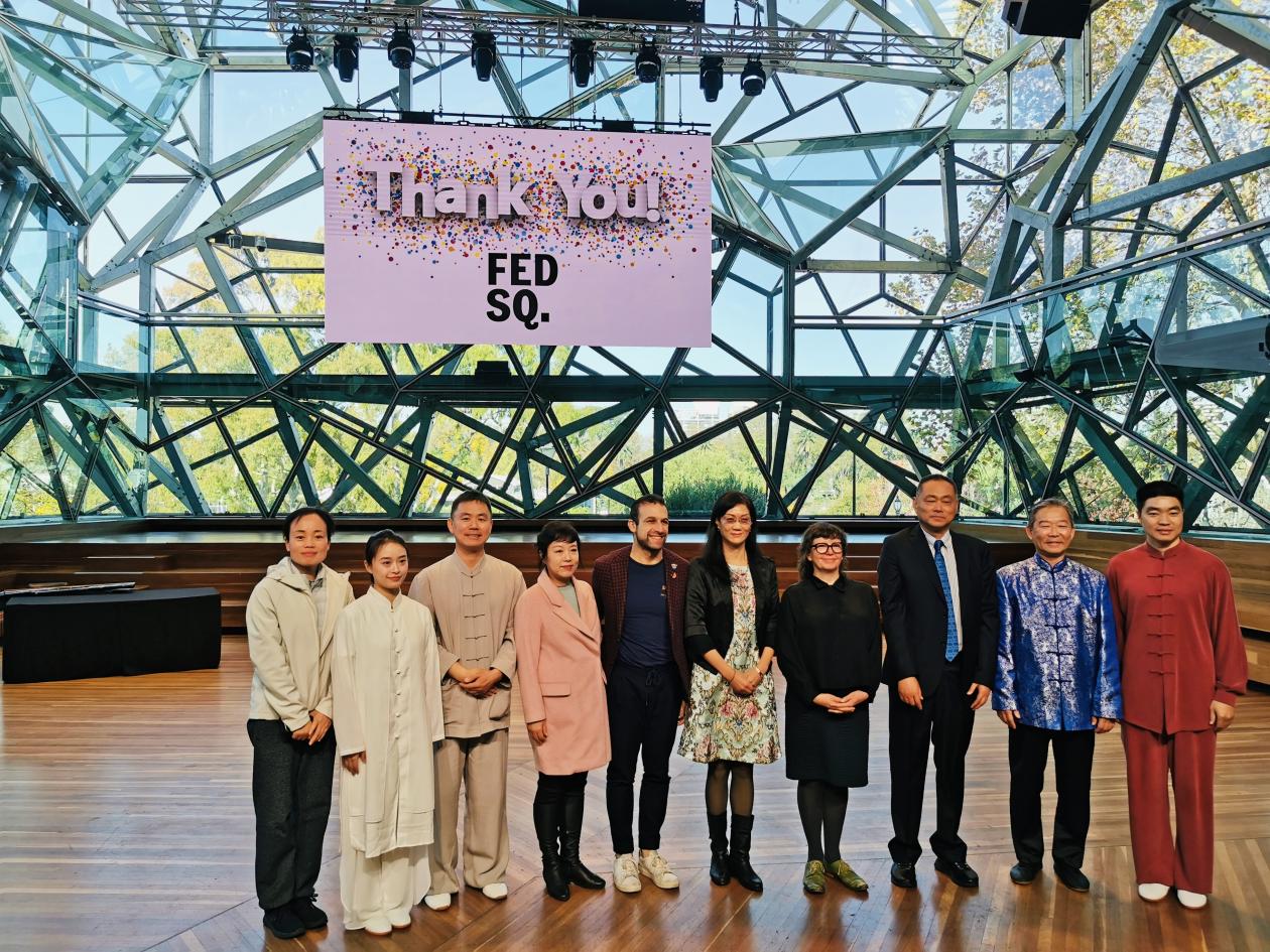 (中国代表团与联邦广场首席执行官Katrina Sedgwick、中国驻墨尔本总领事馆副总领事刘东源、墨尔本市政府议员Councillor Jamal Hakim、澳大利亚太极学院院长韩劲松合影)