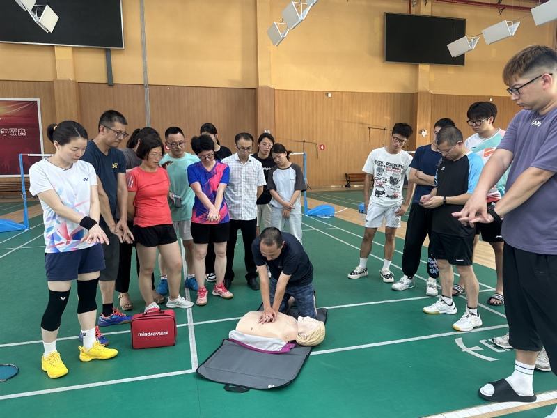 日前,一场由校教工羽毛球协会举办的心肺复苏(CPR)和自动体外除颤器(AED)培训在校体育馆羽毛球馆举行。培训活动邀请了医学院副教授朱舜为师生学员现场示范指导。