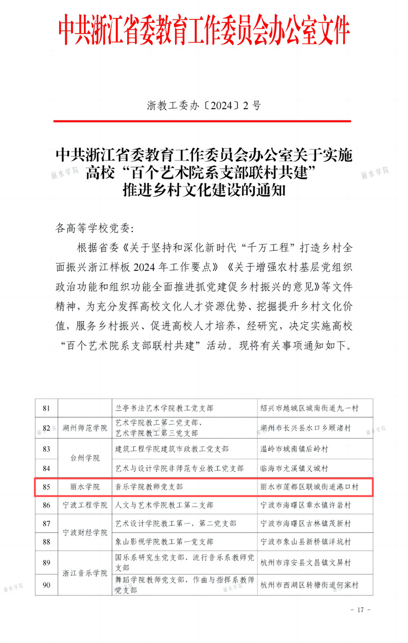 近日,省委教育工委发布了《关于实施高校“百个艺术院系支部联村共建”推进乡村文化建设的通知》,我校音乐学院教师党支部成功入围全省“百个艺术院系支部联村共建”名单,这是该党支部培育创建教育部“全国党建工作样板支部”重要阶段性成果。