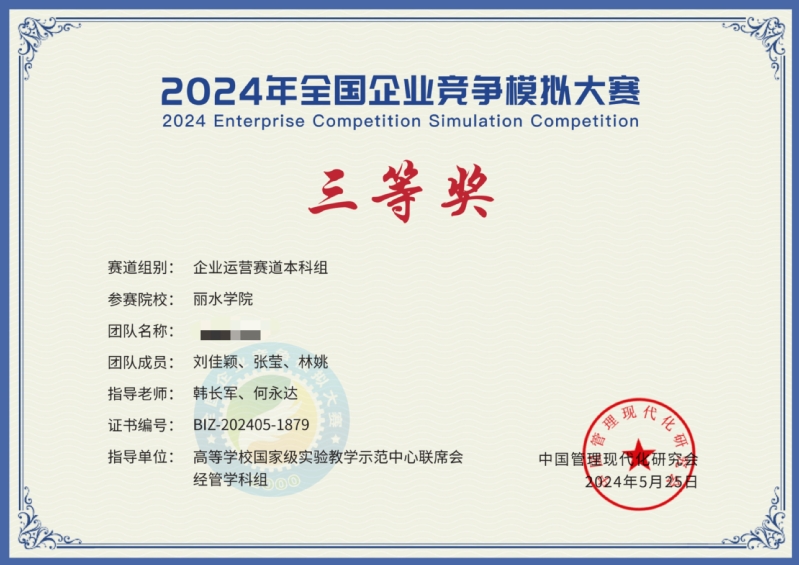 日前,2024年全国大学生企业竞争模拟大赛落下帷幕,我校商学院学生获3项全国三等奖。