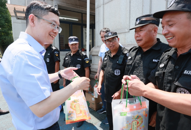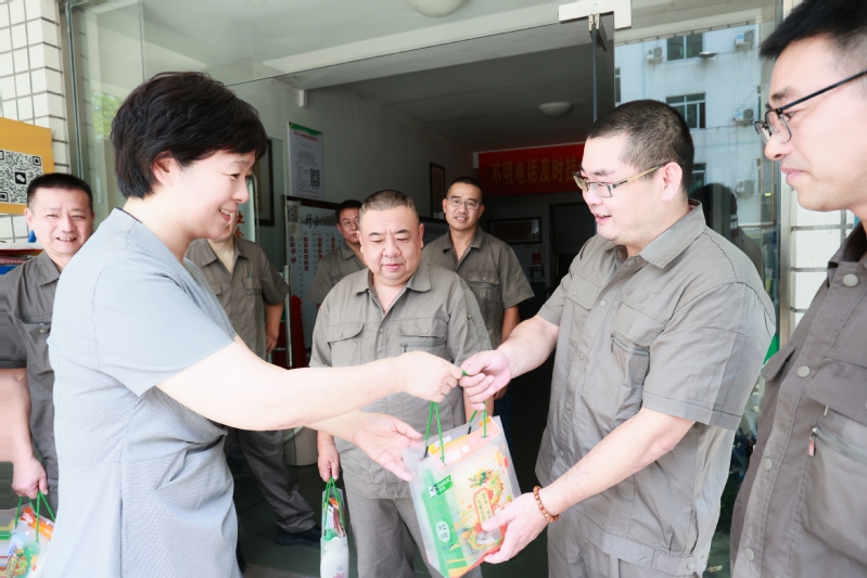 王赳到学生公寓、红色文化广场、南门花坛等地看望慰问水电、绿化、环卫等后勤工作人员。她表示,后勤工作事无巨细,且很多时候需要在户外作业,感谢大家为学校辛勤付出,希望大家千万注意防暑降温,及时补水,保重身体。