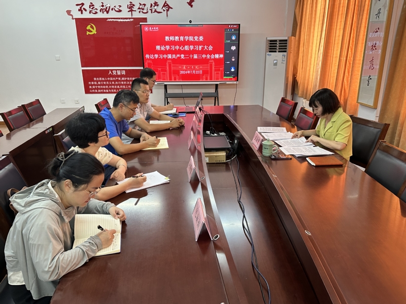 7月22日上午,教师教育学院召开党委理论学习中心组学习会,专题学习贯彻党的二十届三中全会精神,该院党政班子成员、各党支部书记通过线上、线下形式参加会议。