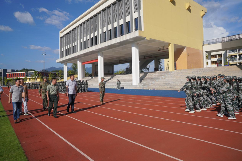 日前,松阳县委常委、县人武部上校部长刘坚强,松阳县教育局党委委员、总督学李林超等莅临松阳校区调研指导新生军训工作。