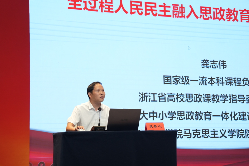 研讨会现场,马克思主义学院院长龚志伟作了题为“多方联动 统筹推进——全过程人民民主融入思政教育一体化的丽水探索”主旨报告,介绍了学校通过与市人大机关、丽水市教育工委等部门的联动,探索开展全过程人民民主系列思政实践教学和研究模式,目前已有500余人次参加现场教学活动,并在大中小学中形成了积极的影响。今后,马院将紧紧围绕建好思政课,建强师资队伍,搭建思政平台等方面持续发力,开展系列活动,打造思政品牌,不断推动一体化工作持续优化。