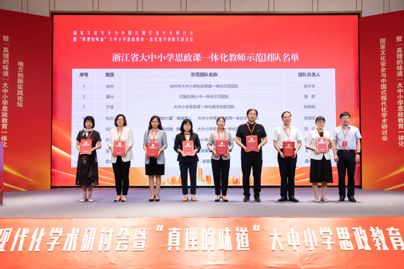 为了进一步学习贯彻党的二十届三中全会精神,推进中国式现代化与国家文化安全融入大中小学思政教育一体化建设,近日,“国家文化安全与中国式现代化学术研讨会暨‘真理的味道’大中小学思政教育一体化地方创新实践论坛”在台州举办。会议为浙江省大中小学思政课教师一体化示范团队和思想政治教育一体化品牌建设优秀案例进行颁奖,我校马克思主义学院“红绿古·浙丽思”团队荣获示范团队。