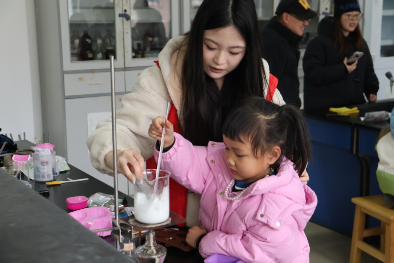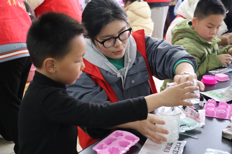 樱花园活动结束后,众人来到生态学院化学化工实验室。孩子们在志愿者的指导下,亲手调配原料、搅拌皂液、添加香精和色素,体验化学反应的奇妙。当一块块色彩缤纷、造型可爱的肥皂脱模而出时,孩子们欢呼雀跃,争相展示自己的作品。活动不仅让孩子们在实践中感受到化学的乐趣,更在欢声笑语中激发了他们对科学的探索热情。