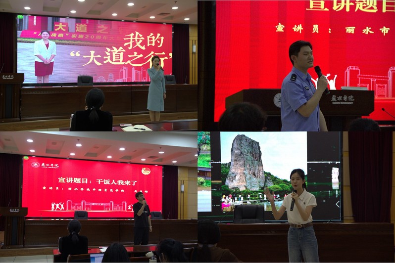 图书馆两山报告厅内,金牌宣讲员进校园活动掀起热潮。丽水市青年宣讲导师施燕薇、市新闻传媒中心主持人赵凯、市00后talker宣讲团成员胡晋源,以及校宣讲团成员饶晨晗、吴宗衡同台开讲,以青春视角解码时代命题。