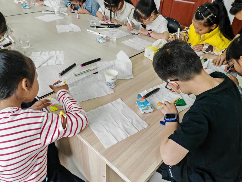 在《探秘畲族》课堂上,志愿者通过图文讲解、互动问答,带领孩子们走进畲族历史与传统服饰文化。随后,孩子们以纸巾为“画布”,用彩色笔晕染出畲族服饰的斑斓纹样,在艺术创作中感受民族文化的独特魅力。“原来畲族的彩带花纹有这么美的寓意!”一名孩子在完成作品后兴奋地说道。