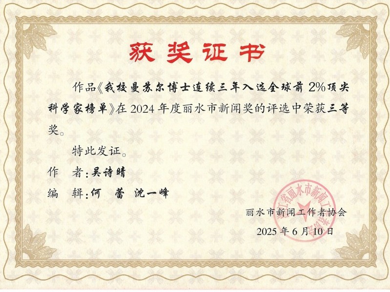 近日,丽水市新闻工作者协会评选出2024年度丽水市新闻奖,我校作品《卓么措:潜心育人传薪火,跋涉田野守文脉》( 作者:温杰芸、赵舒逸 )获二等奖。作品《我校曼苏尔博士连续三年入选全球前2%顶尖科学家榜单》(作者:吴诗晴 )获三等奖。